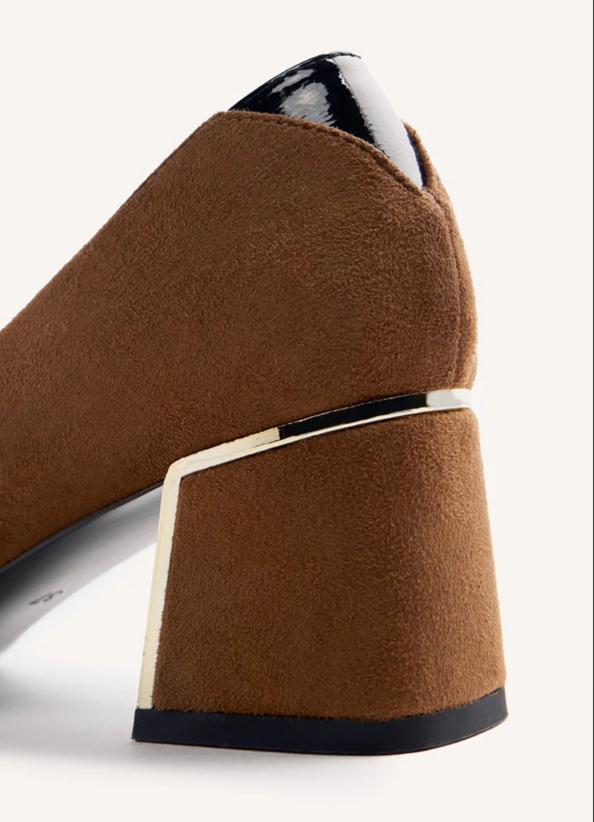 Décolleté con tacco con finitura effetto suede e colori e texture a contrasto. Punta affusolata con inserto in vernice. Hanno suola imbottita e tacco a blocco con inserto metallico in finitura oro. Altezza tacco: 5,5 cm.