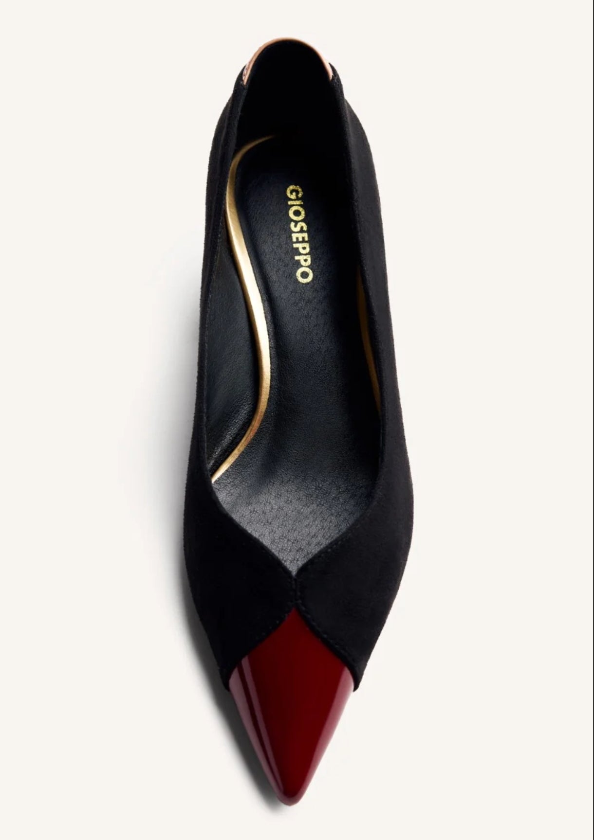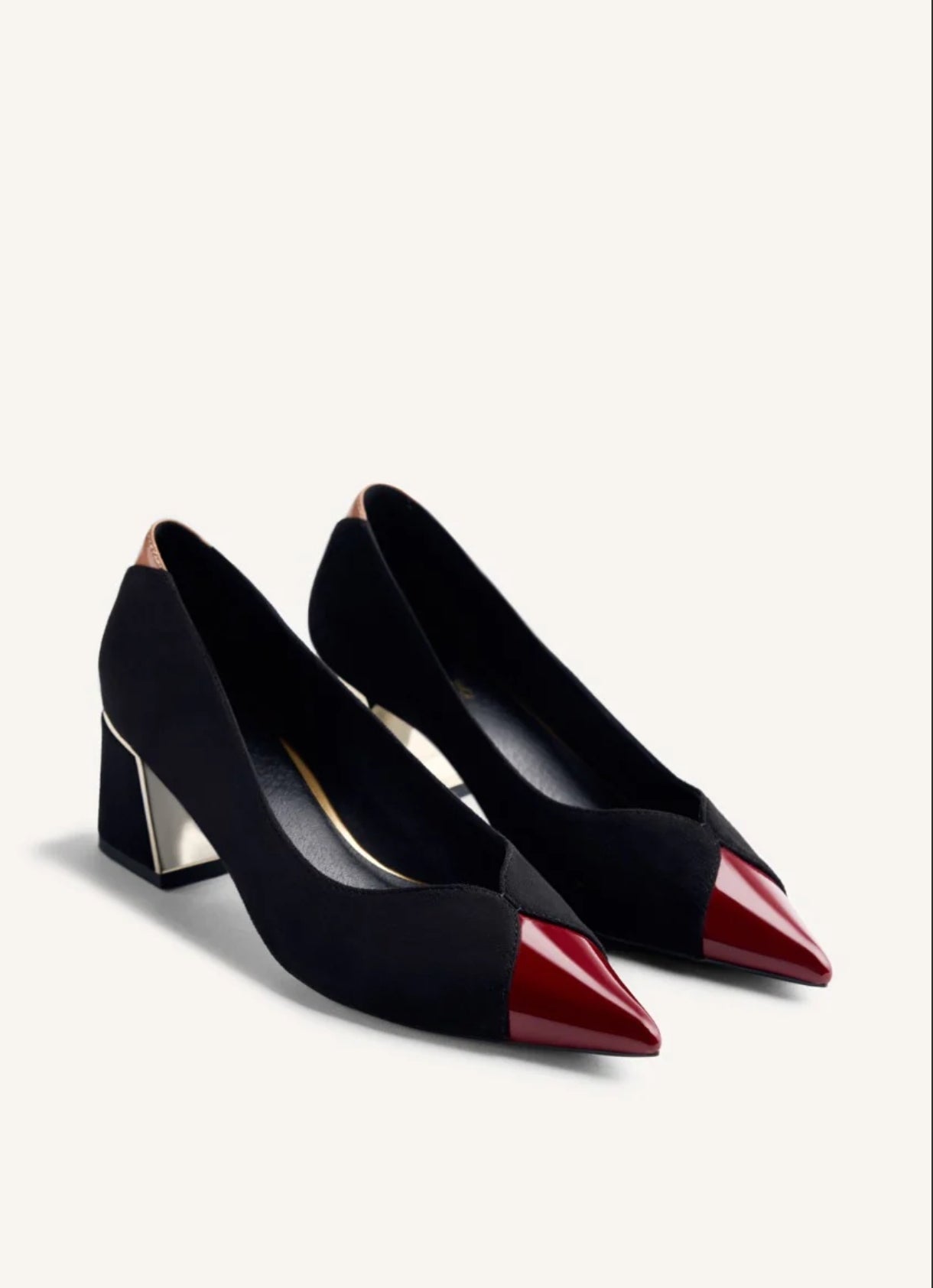 Décolleté con tacco con finitura effetto suede e colori e texture a contrasto. Punta affusolata con inserto in vernice. Hanno suola imbottita e tacco a blocco con inserto metallico in finitura oro. Altezza tacco: 5,5 cm.