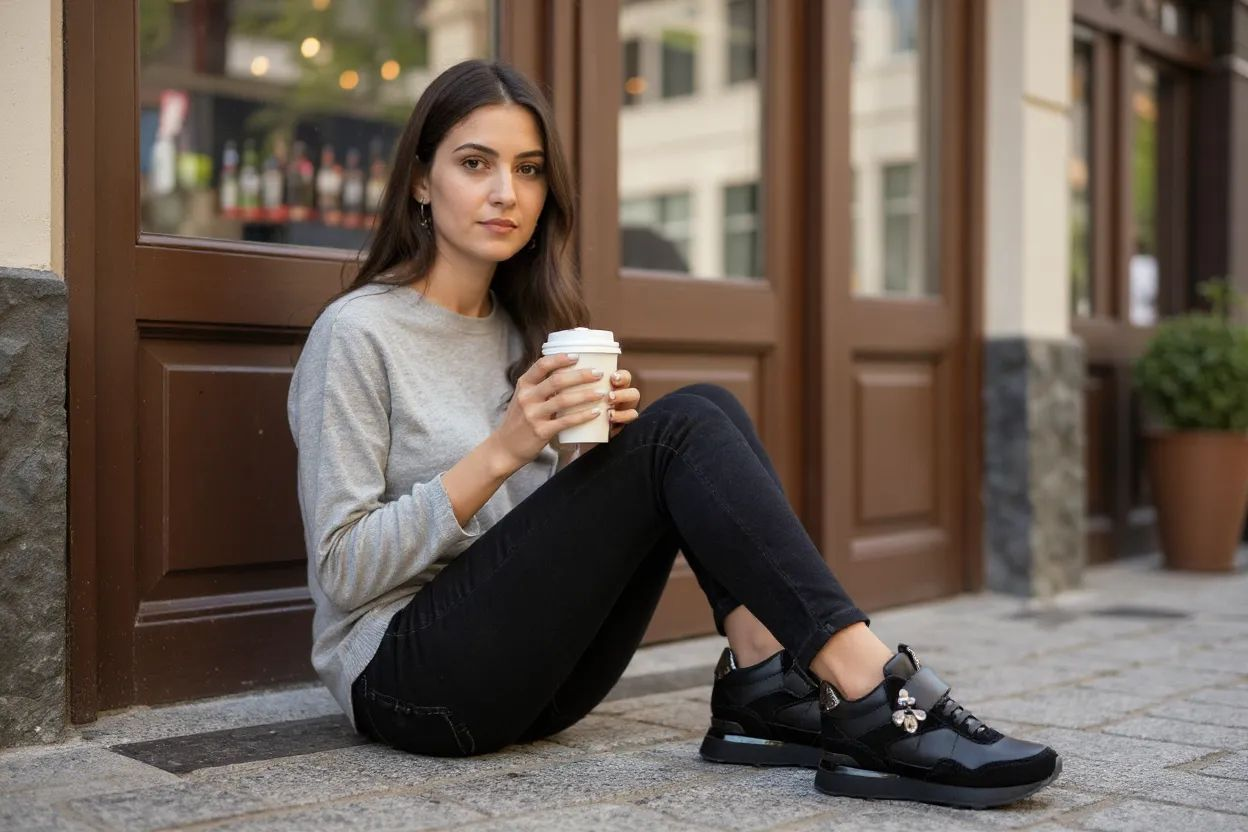 Sneakers in pelle scamosciata con zeppa interna. Hanno una soletta imbottita e uno stabilizzatore del tallone. Chiusura regolabile con decorazione gioiello. Lacci elastici. Altezza zeppa interna: 3 cm.